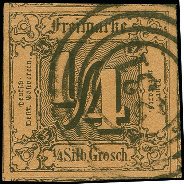 | Zusatzinformationen und Suchstichworte: | Heinrich Köhler 384. Auktion 19./20., 23. - 28. September 2024 Los 4216 Altdeutschland Thurn und Taxis ¼ Silbergroschen auf braunorange, breit- bis überrandig, mit Teilen von 6 Nachbarmarken, sauber entwertet durch Nr. "231". Ein tadelloses Ausnahmestück. Ausruf 100,00 EUR |