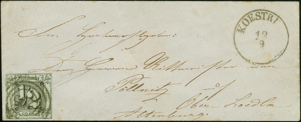 | Zusatzinformationen und Suchstichworte: | Heinrich Köhler 384. Auktion 19./20., 23. - 28. September 2024 Los 4222 Altdeutschland Thurn und Taxis ½ Silbergroschen auf olivgrau, voll- bis breitrandig, links mit Teil der Nachbarmarke, mit Nr. "295" und sauber nebengesetztem EKr. "KOESTRITZ 12/9" auf kleinem Briefkuvert zum ermäßigten Tarif nach Pöllnitzt in Sachsen. Einwandfrei. Ausruf 120,00 EUR |