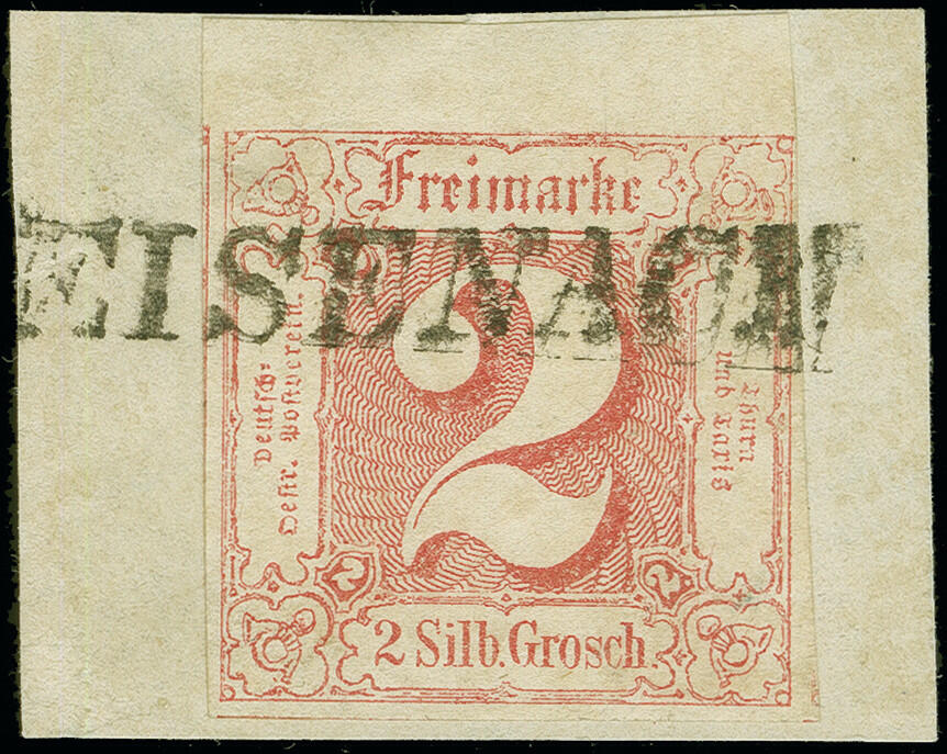 | Zusatzinformationen und Suchstichworte: | Heinrich Köhler 384. Auktion 19./20., 23. - 28. September 2024 Los 4237 Altdeutschland Thurn und Taxis 2 Sgr. karminrot, voll- bis überrandig, dreiseitig mit Teilen von Nachbarmarken und oben mit ca. 4 mm Bogenrand, mit klar aufgesetztem L1 "EISENACH" auf Briefstück. Tadellos Ausruf 120,00 EUR |