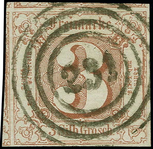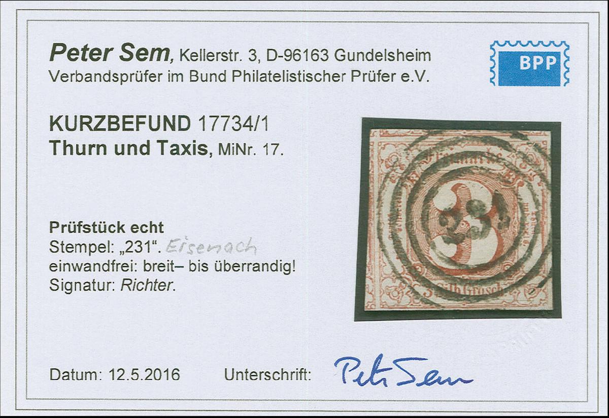 | Zusatzinformationen und Suchstichworte: | Heinrich Köhler 384. Auktion 19./20., 23. - 28. September 2024 Los 4240 Altdeutschland Thurn und Taxis 3 Sgr. braunrot, breit- bis überrandig, mit Teilen von 4 Nachbarmarken, zentrisch und sauber entwertet durch Nr. "231" EISENACH. Tadellos. Ausruf 80,00 EUR |