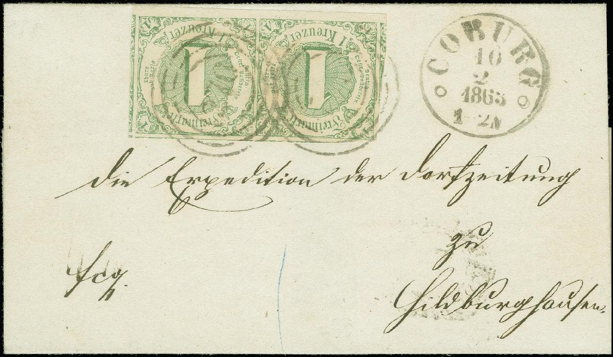 | Zusatzinformationen und Suchstichworte: | Heinrich Köhler 384. Auktion 19./20., 23. - 28. September 2024 Los 4247 Altdeutschland Thurn und Taxis 1 Kr. grün im waagerechten Paar, allseits überrandig, mit Teilen von 5 Nachbarmarken und unten schmalem Bogenrand, mit Nr. "270" und sauber nebengesetztem EKr. "COBURG 10 2 1863" auf kleiner Briefhülle nach Hildburghausen. Tadellos. Ausruf 100,00 EUR |