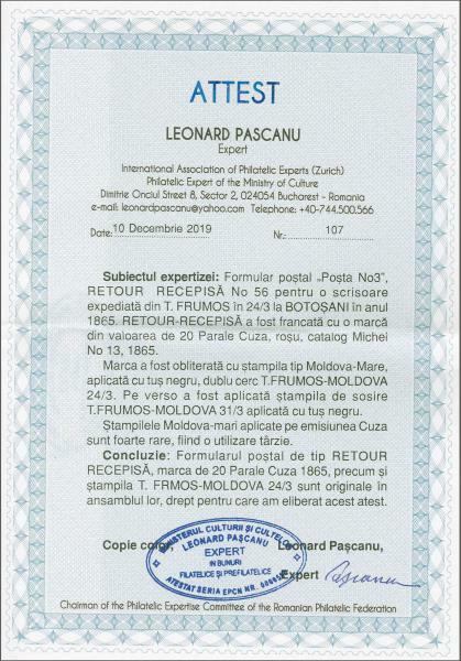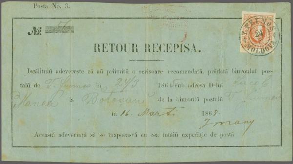 | Zusatzinformationen und Suchstichworte: | 321. - 332. Corinphila Auktion 02. - 08. Juni 2024 Los 6188 Rumänien 1865: Cuza 20 pa. rosa, Type I, gerandet groß abklären, entwertet auf 1865 "Retour Recepisa" blau Vordruckformular (Posta Nr. 3) adressiert an Botosani, entwertet mit "T. FRUMOS/MOLDOVA 24/3" in schwarz (Kiriac fig. 296). Rückseitig mit ein weiterer Abschlag (31/3). Kleine Unzulänglichkeiten aber eine seltene und attraktive Verwendung. Ausruf 500,00 CHF |