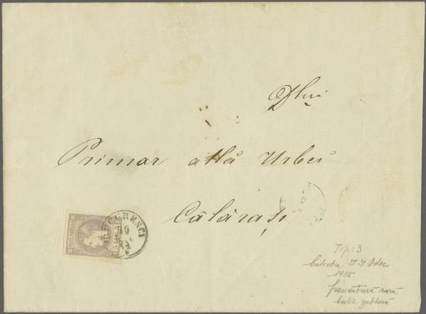 | Zusatzinformationen und Suchstichworte: | 321. - 332. Corinphila Auktion 02. - 08. Juni 2024 Los 6211 Rumänien 1868: 3 bani violett auf gelbem Papier (LPZC 24h) voll- bis breitrandig (Transfer-Type 3), entwertet mit klarem kleines "BUCURESCI 30 April 71" Kreisdatumsstempel auf Drucksache an die Bürgermeisters von Calarasi mit undeutliche Ankunftsstempel in blau, feine und seltene Frankatur hierzu selten Papier Ausruf 1.000,00 CHF |