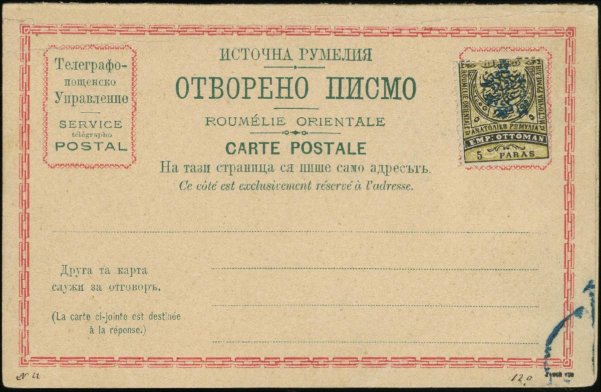 | Zusatzinformationen und Suchstichworte: | Heinrich Köhler 384. Auktion 19./20., 23. - 28. September 2024 Los 1122 Ostrumelien 1885,5pa schwarz auf oliv, Type I, Überdruck in blau, aufgeklebt auf Postkarte für Ortsverkehr, mit beigefügter Antwortkarte, beide ungebraucht, Tintenfleck unten rechts, sonst fein, handgestempelt Zagorsky, mit seinem 1995 Attest Ausruf 100,00 EUR |