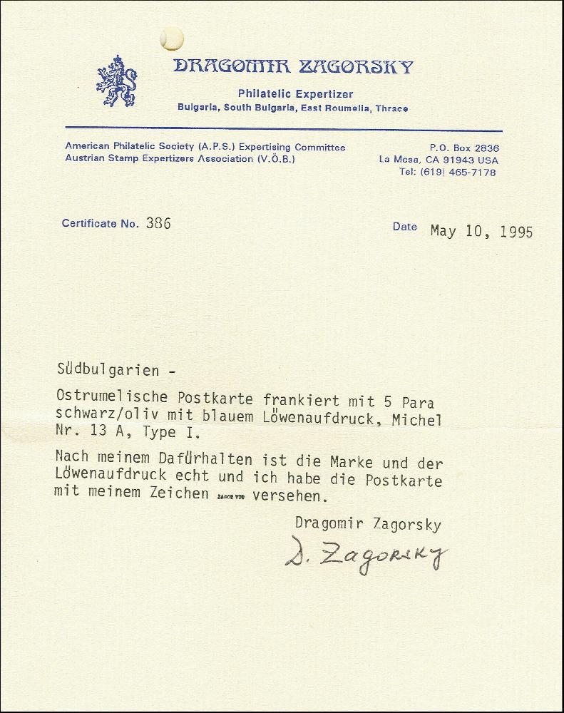 | Prüfer: | Zagorsky, Dragomir (VÖB (Verband Österreichischer Briefmarkenprüfer)) |