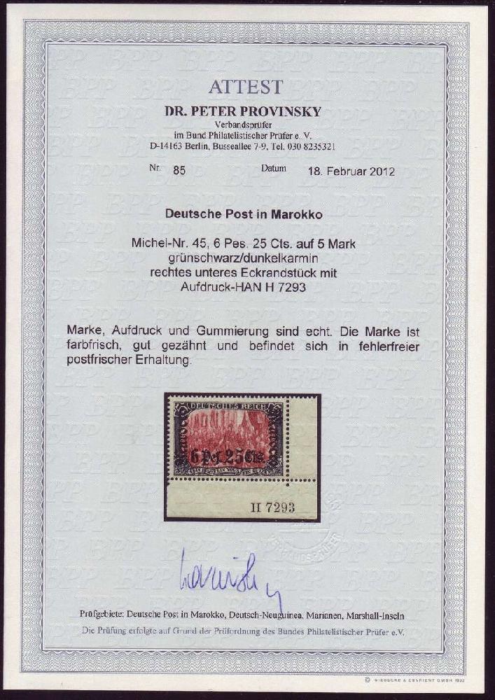 | Zusatzinformationen und Suchstichworte: | Christian E. Geigle Briefmarkenfachhandel Los 0002022281 Deutsche Auslandspost Marokko 1906, 6 P. 25 C. auf 5 M. Reichsgründungsgedenkfeier mit Wasserzeichen, mit Aufdruck "Marocco" in Frakturschrift, postfrisches Luxusstück aus der rechten unteren Bogenecke mit Aufdruck-HAN "H 7293", farbfrisch und gut gezähnt, unsigniert mit FA Dr. Provinsky "fehlerfrei". Festpreis 990,00 EUR |