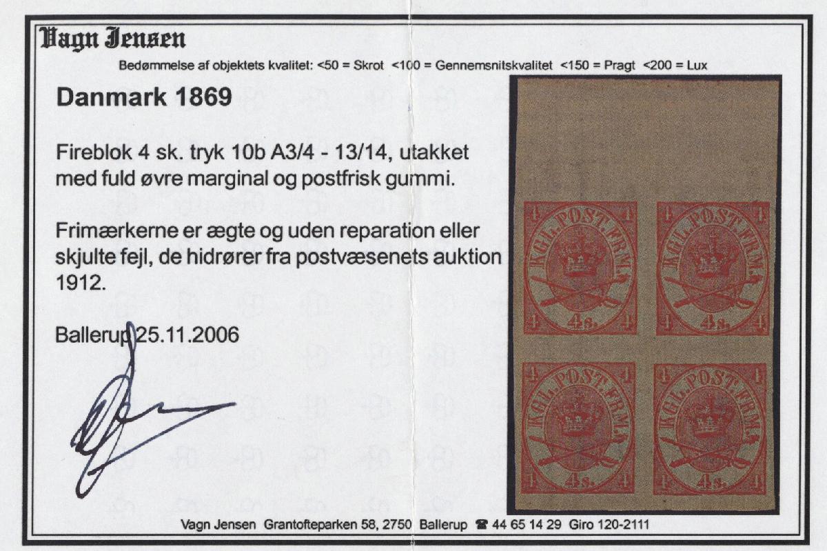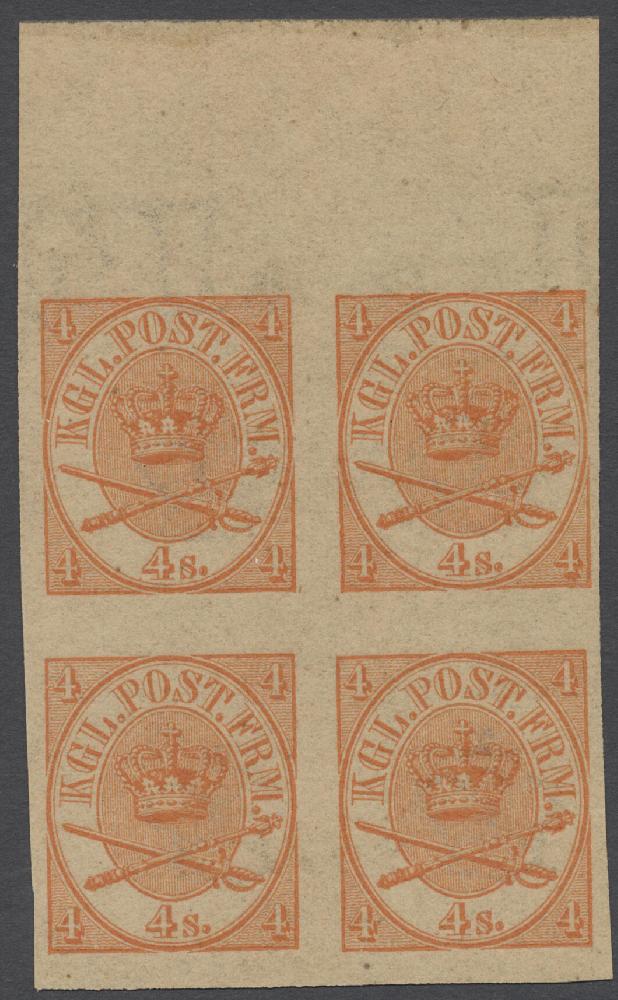 | Zusatzinformationen und Suchstichworte: | Christoph Gärtner 60. Auktion 14. - 18. Oktober 2024 Los 4761 Dänemark 1864. 4Sk. 4er-Block, ungezähnt. Postfrisches Ausstellungsstück, Druck 10b, Feld 3/4 -13/14, mit vollem Rand oben. Ausruf 450,00 EUR |