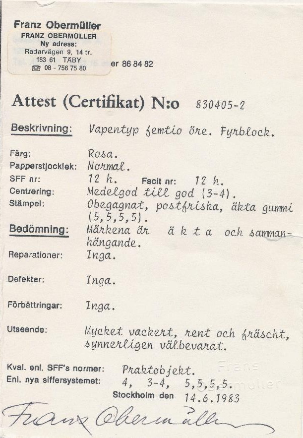 | Zusatzinformationen und Suchstichworte: | Postiljonen 242. & 243. Int. Briefmarken Auktion 24.-27. September 2024 Los 2165 Schweden Wappen Ausgabe An exceptional never hinged block of four of 50 öre rose. F=70.000+. Cert. Franz Obermüller. SUPERB ITEM. Ausruf 750,00 EUR |