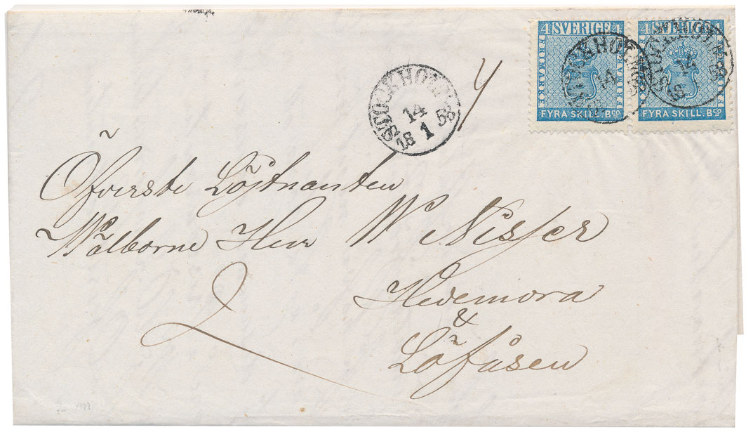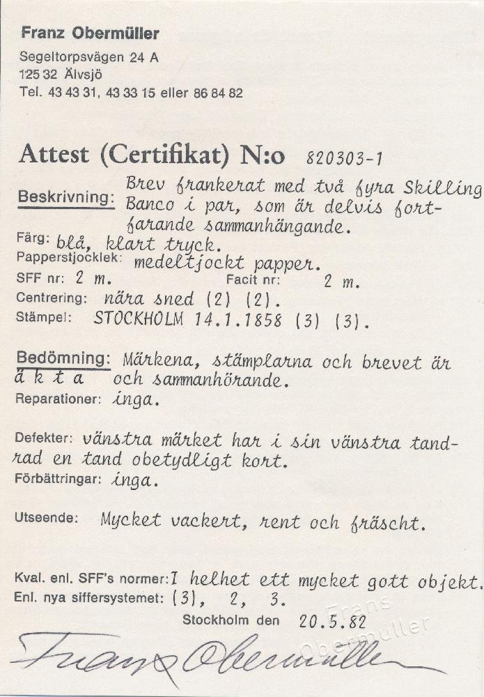 | Zusatzinformationen und Suchstichworte: | Postiljonen 242. & 243. Int. Briefmarken Auktion 24.-27. September 2024 Los 2033 Schweden Skilling Banco A very beautiful second rate cover franked with a pair of 4 Sk. Bco blue with clear print "STOCKHOLM 14.1 1858". One short perf. of little importance. Cert. Franz Obermüller. VERY FINE COVER. Ausruf 500,00 EUR |