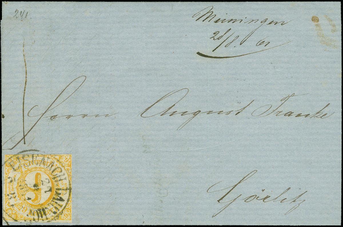 | Zusatzinformationen und Suchstichworte: | Heinrich Köhler 384. Auktion 19./20., 23. - 28. September 2024 Los 4251 Altdeutschland Thurn und Taxis 9 Kr. gelb, farbfrisch und voll-bis breitrandig, unten und links mit kleinen Teilen der Nachbarmarken, mit EKr. "EISENACH BAHNHOF" auf komplettem Faltbrief mit handschriftlichem Übernahme-Vermerk "Meiningen 28/8 61" nach Görlitz mit Ankunftsstempel vom nächsten Tag Ausruf 300,00 EUR |