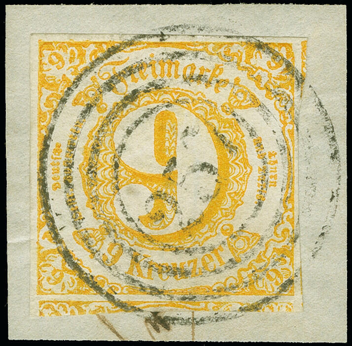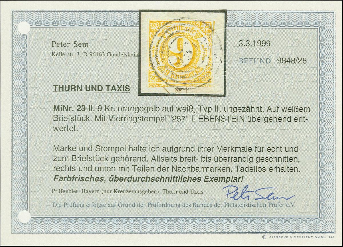 | Zusatzinformationen und Suchstichworte: | Heinrich Köhler 384. Auktion 19./20., 23. - 28. September 2024 Los 4252 Altdeutschland Thurn und Taxis 9 Kr. orangegelb, Type II, breit- bis überrandig, mit Teilen von 2 Nachbarmarken, mit Nr.. "257" LIEBENSTEIN auf Briefstück. Ein überdurchschnittliches Exemplar in tadelloser Erhaltung. Ausruf 80,00 EUR |