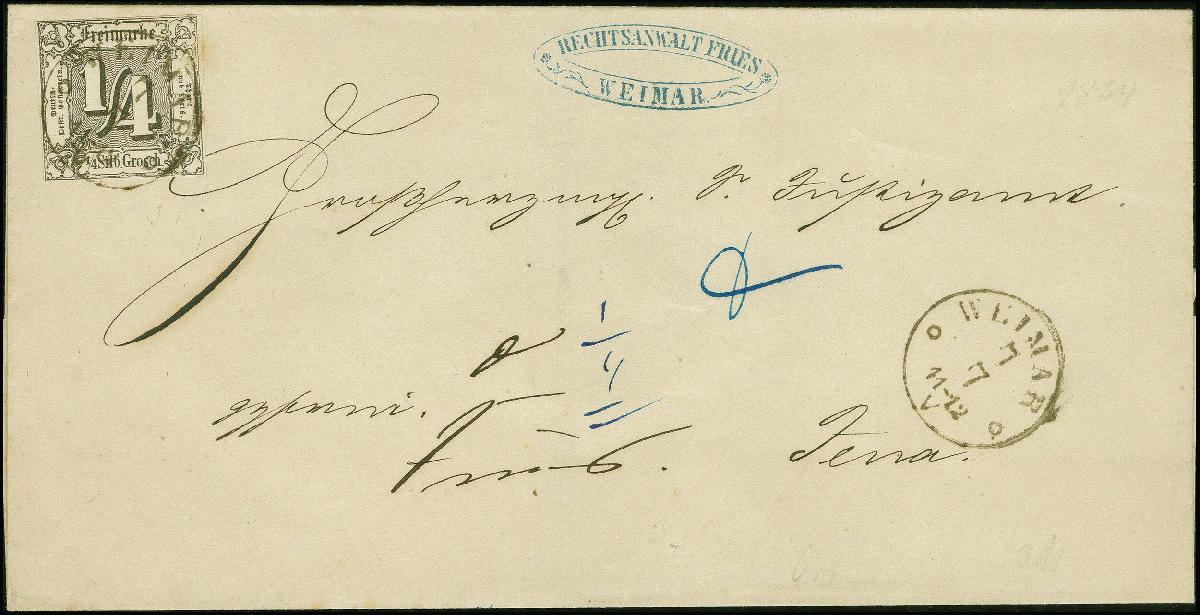 | Zusatzinformationen und Suchstichworte: | Heinrich Köhler 384. Auktion 19./20., 23. - 28. September 2024 Los 4258 Altdeutschland Thurn und Taxis ¼ Sgr. schwarz, voll- bis breitrandig, mit sauber auf- und nebengesetztem DKr. "WEIMAR 7/7" als Bestellgeld-Frankatur auf portofreiem Brief mit vorderseitigem Absenderstempel "RECHTSANWALT FRIES/WEIMAR ", nach Jena. Vorderseitiger Vermerk "gzfrei", "0" und Unterschrift "Fries". Eine in dieser Form außerordentlich seltene Einzelfrankatur. Ausruf 800,00 EUR |