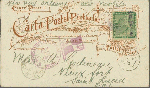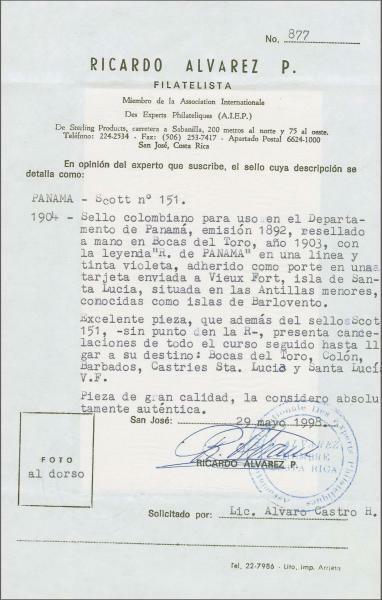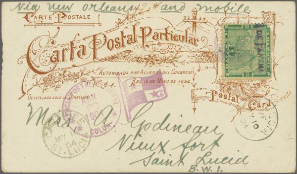 | Zusatzinformationen und Suchstichworte: | 321. - 332. Corinphila Auktion 02. - 08. Juni 2024 Los 3773 Panama 1903: erster Bocas del Toro Provisorien, 1 c. grün, verwendet auf eine Ansichtskarte, ab Bocas del Toro zu Vieux Fort, St. Lucia (Britisch West-Indien), datiert April 1904, entwertet durch undeutlichen Zweikreis in purpur, bestätigt über New Orleans und mobil, mit Colón Fahne Duplex-Stempel in purpur 28 April 1904 daneben, ein Ankunft Castries St. Lucia 10 Mai 1904 und weitere St Lucia Kreisdatumsstempel vom gleichen Tag, voraus der Karte ein Barbados Transitkreisdatumsstempel 7 Mai 1904, Briefmarke hat Fehler oben, obwohl glasklar R DE PANAMA Überdruck in violett, ein paar kleinere Unzulänglichkeiten zu Karte welches beeinträchtigen nicht, selten. Eine von acht bekannten Briefe freigemacht mit erster Bocas del Toro Provisorien. Zuschlag 300,00 CHF |