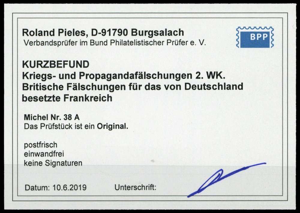 | Zusatzinformationen und Suchstichworte: | DBA Freiburg GmbH Los 1720009226 Kriegs und Propagandafälschungen II. WK 1941, 1.50 Fr. Kriegsfälschung Iris als tadellos postfrische Bogenecke l.u., aktueller Farb- Kurzbefund Pieles BPP vom 10.6.2019 "echt und einwandfrei" (ME 100.-++) Festpreis 50,00 EUR |