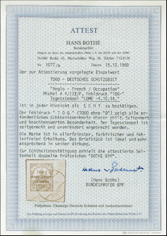 | Prüfgebiet: | Deutsche Kolonien Togo Britische Besetzung |