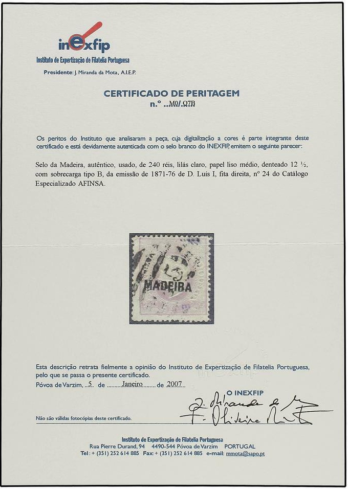 | Zusatzinformationen und Suchstichworte: | Soler y Llach - 810. Auktion - Spanien, ehemalige Kolonien & Ausland 17. - 18. September 2024 Los 3319 Madeira PORTUGAL: MADEIRA. 1871. 240 reis violeta, sobrecarga Tipo B. Muy bonito ejemplar, ligera mancha de antigua marquilla de expertización que transparenta en el anverso. Sello muy raro Ausruf 100,00 EUR |