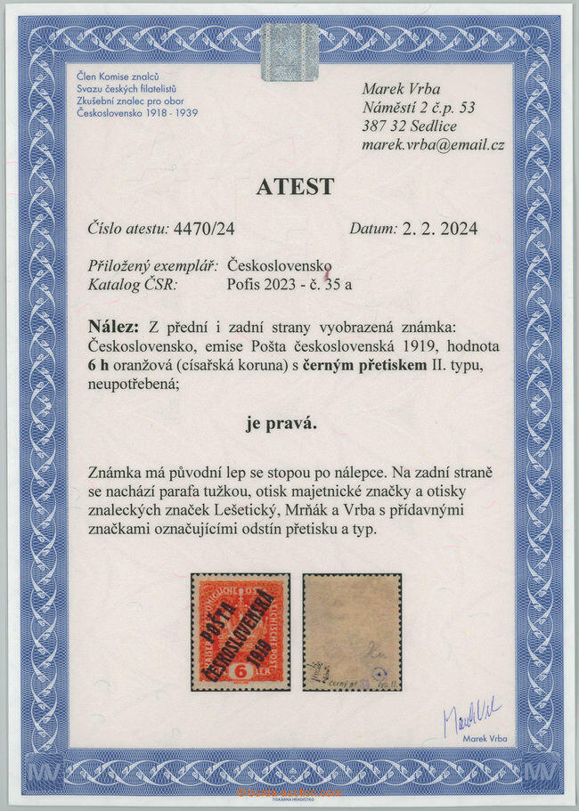 | Zusatzinformationen und Suchstichworte: | Burda 76. Auktion 14. - 15. September 2024 Los 2811 Tschechoslowakei 1918-1939 Pof. 35a, Krone 6h orange, CERNY Überdruck II. Type, gut zentriert stmp sowie Überdruck; gefalzt, kleinere Fehler, insgesamt aber schön Stück Ausruf 2.858,00 EUR |