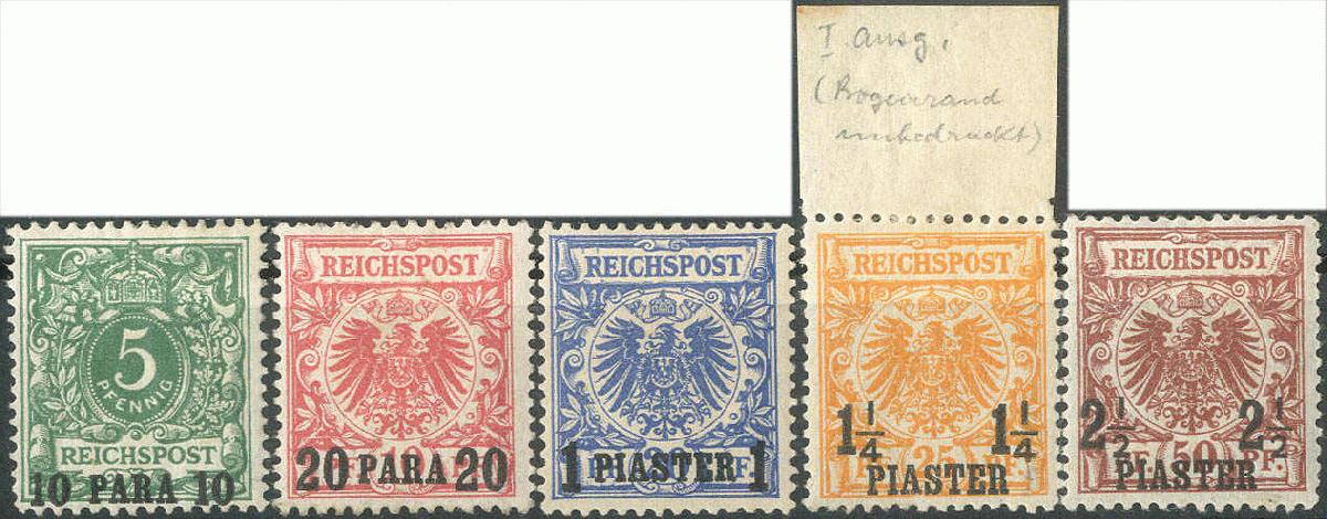 | Zusatzinformationen und Suchstichworte: | 235. Auktion Karl Pfankuch & Co. 6. - 8. August 2024 Los 2070 Deutsche Auslandspost Türkei MiNr. 6-10 I, sogn. I Auflage ungebraucht, Nr. 6-9 Attest Mohrmann, gepr. Willmann, Nr. 10 a gepr., Nr. 9 a mit Oberrand Gummi tropisch, M€ 1850,- Zuschlag 180,00 EUR |