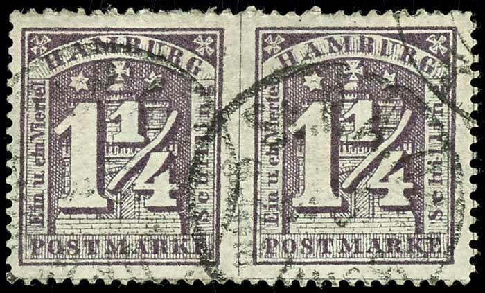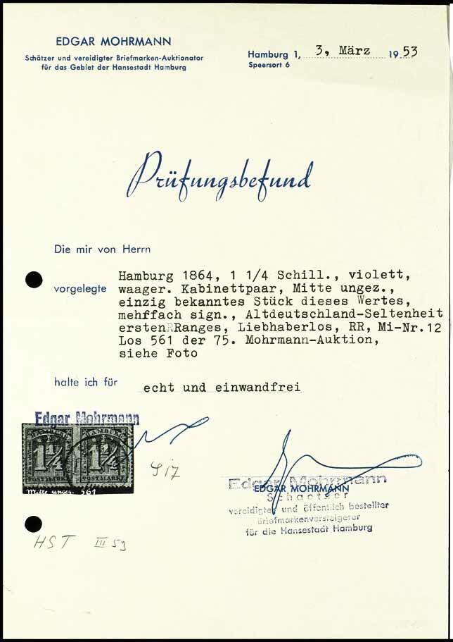 | Zusatzinformationen und Suchstichworte: | Dr. Reinhard Fischer 197. Auktion 14. Juni 2024 Los 182 Altdeutschland Hamburg 1 1/4 Schilling grauviolett, waagerechtes Paar mit Abart "Mitte ungezähnt", entwertet mit schwarzem Einkreisstempel "St. P. A. HAMBURG 18/3 8-10M", linke Marke kleine Zähnungsunebenheiten oben kleiner Einschnitt zwischen den Marken unten nicht das Markenbild betreffend, sonst ist die Erhaltung in frischer Farbe und einwandfrei, bei dem vorliegenden Stück welches auch schon die Sammlung Sellschopp zierte handelt es sich um eine große Hamburg-Rarität, es ist nur dieses Exemplar bekannt - eine Altdeutschland-Rarität die ein Unikat darstellt Zuschlag 3.600,00 EUR |
