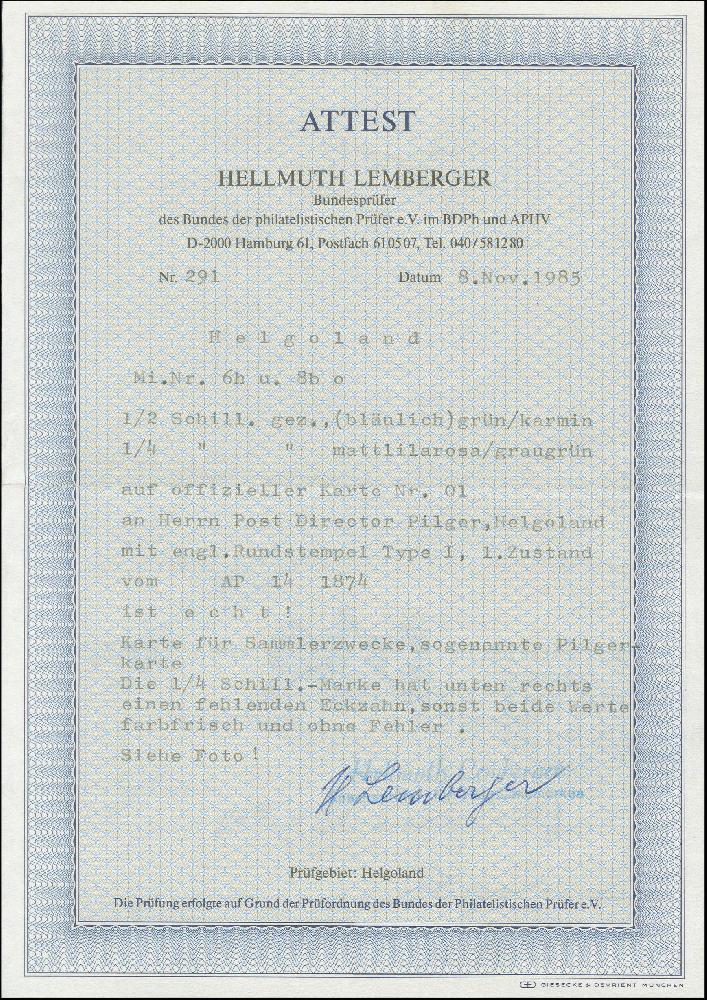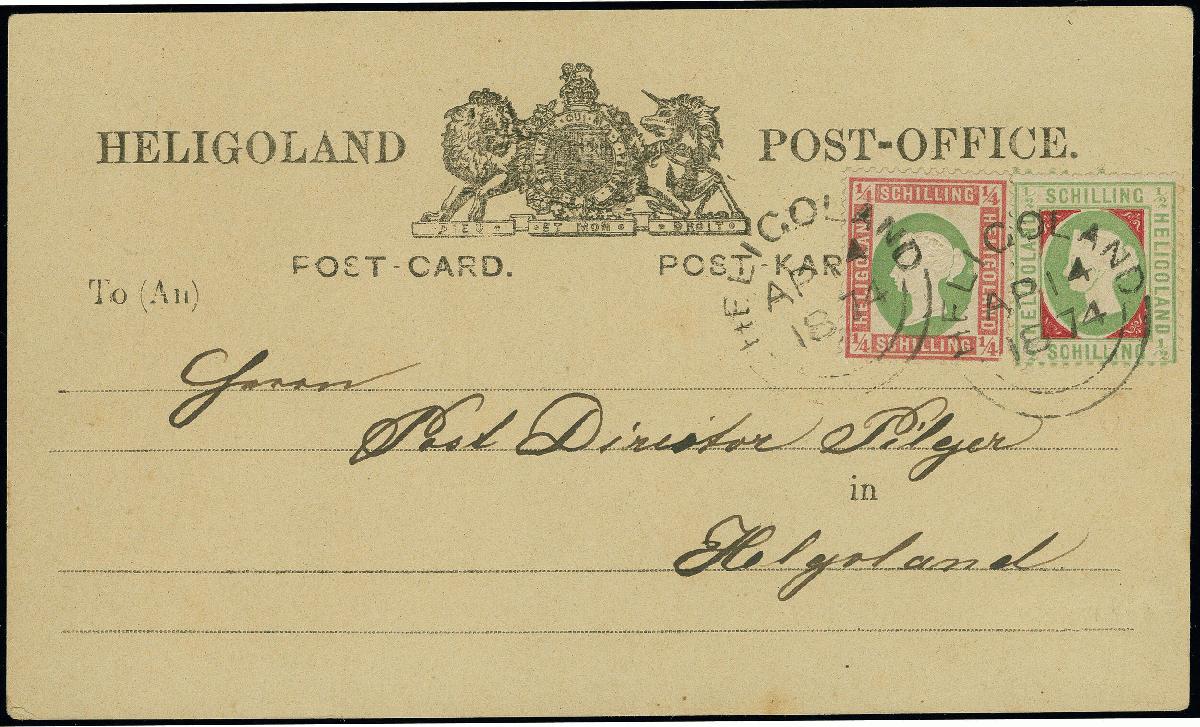 | Zusatzinformationen und Suchstichworte: | Heinrich Köhler 384. Auktion 19./20., 23. - 28. September 2024 Los 7089 Altdeutschland Helgoland 1873, ¼ Schilling lilarosa/graugrün und 1869/73, ½ Schilling lebhaftbläulichgrün/karmin, sauber mit Kreisstempel "HELIGOLAND AP 14 1874" auf ‘Pilger-Karte’, die ¼ Schilling kleiner Eckfehler, sonst in schöner und attraktiver Erhaltung, eine sehr seltene Karte. Ganzstücke mit der Mi.-Nr. 8 sind nur in ganz wenigen Exemplaren bekannt und stellen völlig unterschätzte Raritäten dar, wir haben insgesamt überhaupt nur fünf Belege registriert. Eine Altdeutschland-Briefseltenheit Ausruf 4.000,00 EUR |