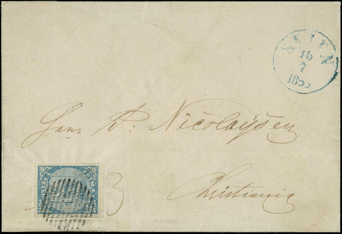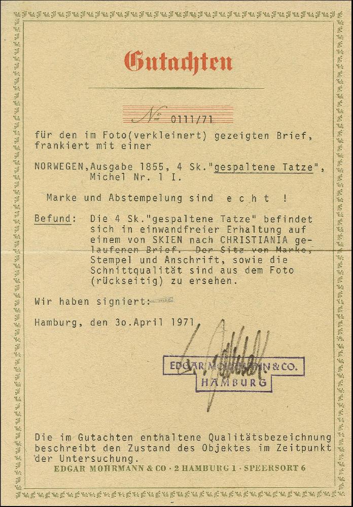 | Zusatzinformationen und Suchstichworte: | Heinrich Köhler 384. Auktion 19./20., 23. - 28. September 2024 Los 1346 Norwegen 1855,4s blau, ringsum breitrandig, mit die "Doppel- Fuss" Abart, sichtbarer auf Lions rechts hand Teilstrecke, entwertet auf Faltbrief bei kreisförmig Balkenstempel, blau Skien Datumsstempel oben rechts (Jul. 16), zu Christiania, ein herrliches Stück dieser seltenen und begehrenswerte Abart Zuschlag 1.400,00 EUR |