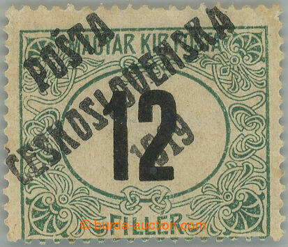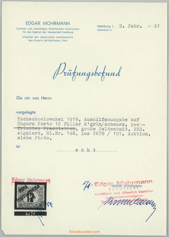 | Zusatzinformationen und Suchstichworte: | Burda 76. Auktion 14. - 15. September 2024 Los 2900 Tschechoslowakei 1918-1939 Pof. 129Px, schwarz Ziffern 12f grün/schwarz, Kammzähnung 15, selten Wasserzeichen Px - L-wards, Aufdruck-Type IV. ; schön Stück mit kleinem opravou in Ecke und Tip gefalzt, leicht getönt, Vrba Attest und Mohrmann, geprüfte Leseticky, mark Kratina, c. v. Pofis für Briefmarke mit Aufklebezettel 150,000Kc, äußerst selten Marke fehlt in meiste Sammlungen! Ausruf 3.674,00 EUR |