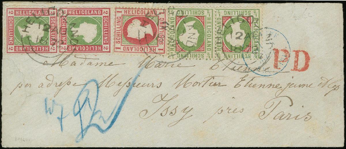 | Zusatzinformationen und Suchstichworte: | Heinrich Köhler 384. Auktion 19./20., 23. - 28. September 2024 Los 7064 Altdeutschland Helgoland 1867, 2 Schilling lilakarmin/dunkelgelblichgrün, zwei Einzelwerte zusammen mit 1869 ½ Schilling grünoliv/karminrot im waagerechten Paar und 1 Schilling karmin/gelblichgrün, als Streifen geklebt, alle Marken farbfrisch und gut durchstochen bzw. gezähnt, sauber mit Kreisbogenstempel “HELIGOLAND 12 AU 1872” auf weißem Kuvert via “HAMBURG 14 8 72” mit ausgewiesenem Weiterfranko “Wf2” nach Issy bei Paris, der Umschlag links mit zugezogenem Risschen, leichte Beförderungs- bzw. Altersspuren, die 1 Schilling leichte Aufklebeknitter, ein enorm attraktiver und außergewöhnlicher Auslandsbrief in fantastischer Optik, Ausstellungsstück Ausruf 5.000,00 EUR |