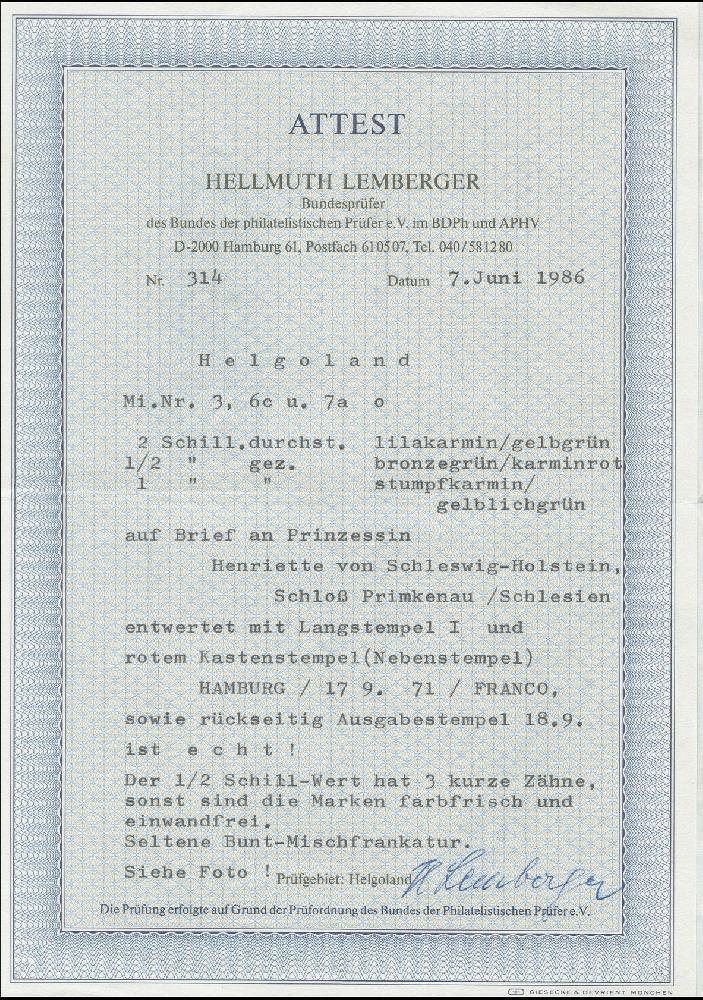 | Zusatzinformationen und Suchstichworte: | Heinrich Köhler 384. Auktion 19./20., 23. - 28. September 2024 Los 7067 Altdeutschland Helgoland 1867, 2 Schilling lilakarmin/dunkelgelblichgrün zusammen mit 1869, gezähnter Ausgabe ½ Schilling grünoliv/karminrot und 1 Schilling karmin/gelblichgrün, alle farbfrisch, einige leicht verkürzte Zähne, sonst tadellos, sauber mit mehrfach abgeschlagenem L1 "HELGOLAND." sowie nebengesetztem roten Ra3 “HAMBURG 17 9 71 FRANCO” auf Briefkuvert adressiert an “Prinzessin Henriette von Schleswig-Holstein, Schloß Primkenau/Schlesien”, eine sehr frische und seltene Frankatur in guter Erhaltung Ausruf 800,00 EUR |