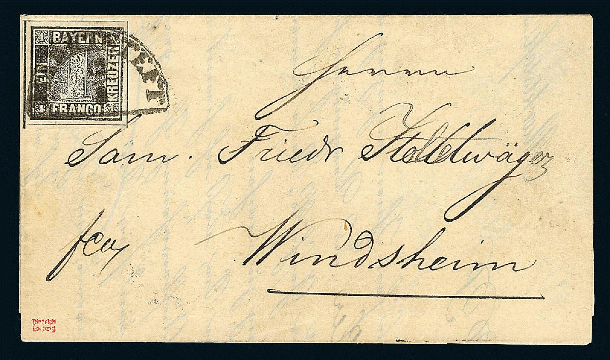 | Zusatzinformationen und Suchstichworte: | 116. Kirstein-Larisch Auktion 6. - 8. Juni 2024 Los 5105 Altdeutschland Bayern 1 Kr. schwarz, Platte 1, farbfrisch und allseits voll-/ breitrandig mit 4 Schnittlinien (2x kpl., 2x durchgehend), Kabinettstück auf Drucksache (Besuchsanzeige, Adresse teilweise überschrieben) mit Ortsstempel- Entwertung durch HK "MARKTSTEFT 12/3" (1850) nach Windsheim Zuschlag 2.000,00 EUR |