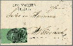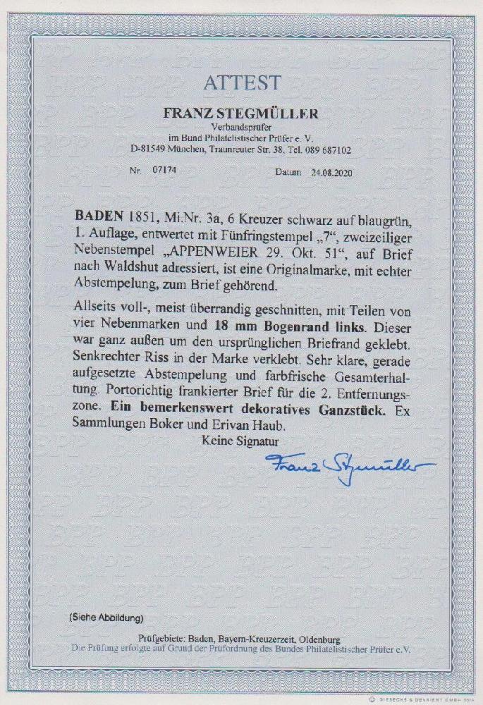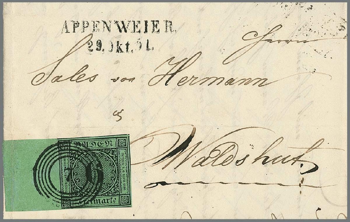 | Zusatzinformationen und Suchstichworte: | Rauhut & Kruschel - 228. Auktion 18. - 19. Oktober 2024 Los 26 Altdeutschland Baden 6 Kr. schw./blaugrün, breit- bis überrandig mit vier Nebenmarken, links 18mm Bogenrand, auf Briefchen mit NS "7" und L2 "Appenweier". Oben (durch "A von BADEN") unauffällig verklebter Riß und links im weiten Bogenrand Faltspur, dennoch ein äusserst dekorativer und mit dem großen Randstück sehr seltener Brief Ausruf 400,00 EUR |