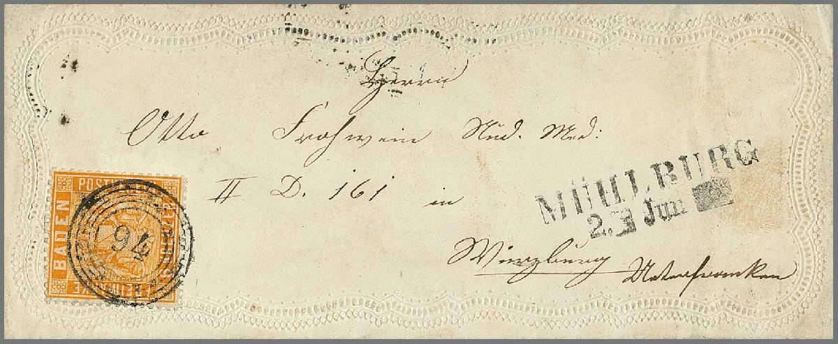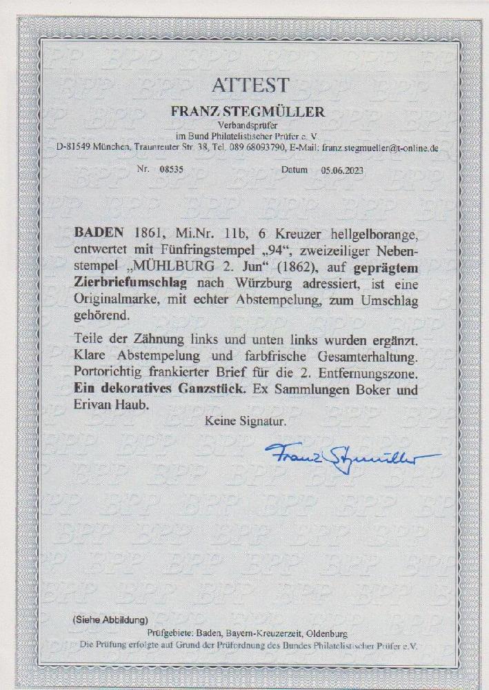 | Zusatzinformationen und Suchstichworte: | Rauhut & Kruschel - 228. Auktion 18. - 19. Oktober 2024 Los 65 Altdeutschland Baden 6 Kr. gelborange einzeln auf dekorativem Präge-Zierbrief mit klarem NS "94" und L2 "Mühlburg", links und unten unauffällige Zahnergänzungen, dennoch ein schöner Zierbrief in ansonsten ursprünglicher Erhaltung Ausruf 400,00 EUR |
