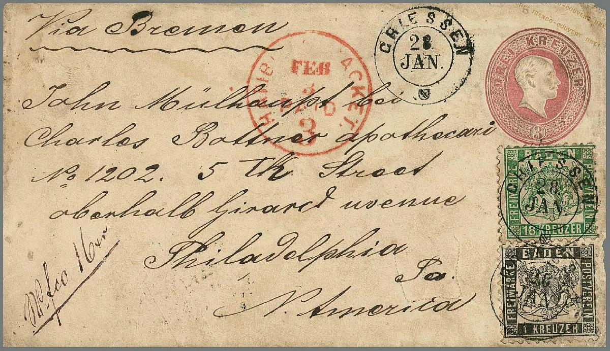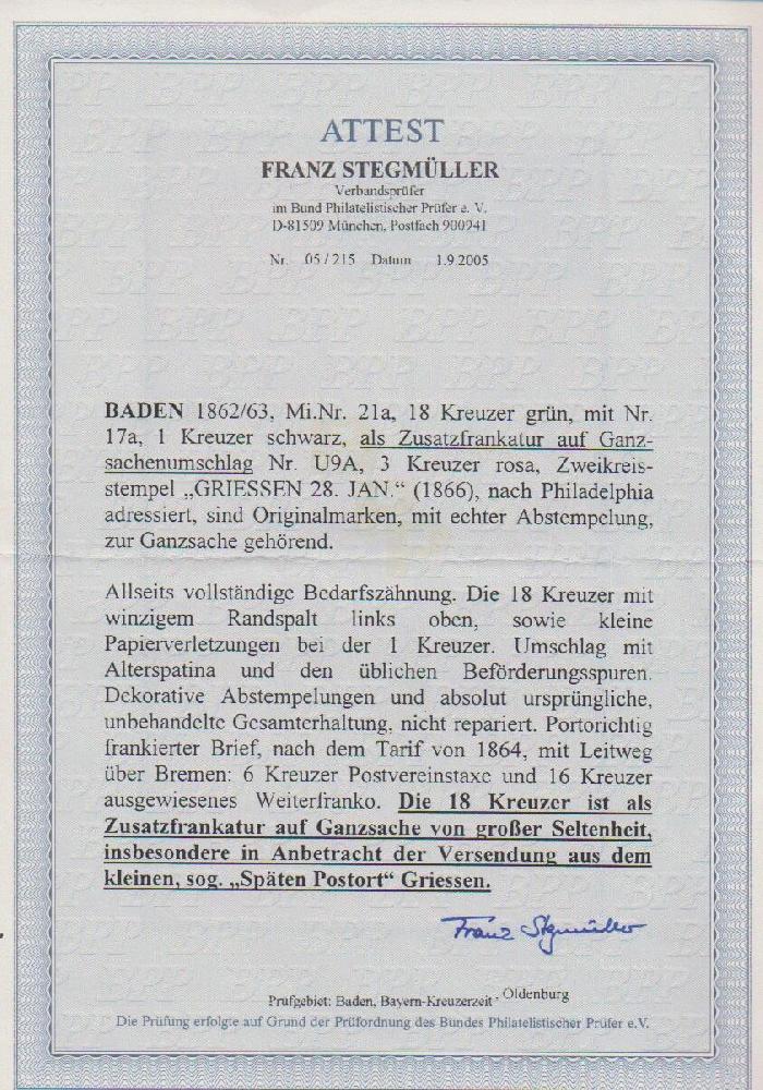 | Zusatzinformationen und Suchstichworte: | Rauhut & Kruschel - 228. Auktion 18. - 19. Oktober 2024 Los 95 Altdeutschland Baden 18 Kr. grün und 1 Kr. schwarz auf Ganzsache 3 Kr. rosa mit K2 "Griessen" 1866 via Bremen nach Philadelphia/USA. 18 Kr. kleiner Randspalt und 1 Kr. kleine Papierverletzung sowie leichte Alterspatina, ansonsten in völlig unbehandelter, ursprünglicher Gebrauchserhaltung. Die 18 Kr.-Marke ist als Zusatzfrankatur auf Ganzsache sehr selten, zumal in Verbindung mit einem guten Stempel aus einem kleinen, sog. "späten Postort". Aus der 96. Rauhut-Auktion 2006, damals noch in Verbindung mit einer weiteren Ganzsache aus gleicher Korrespondenz mit u.a. der 30 Kr.-Marke Ausruf 1.500,00 EUR |