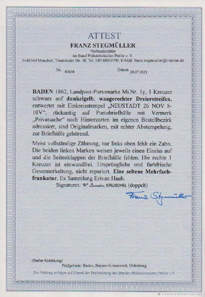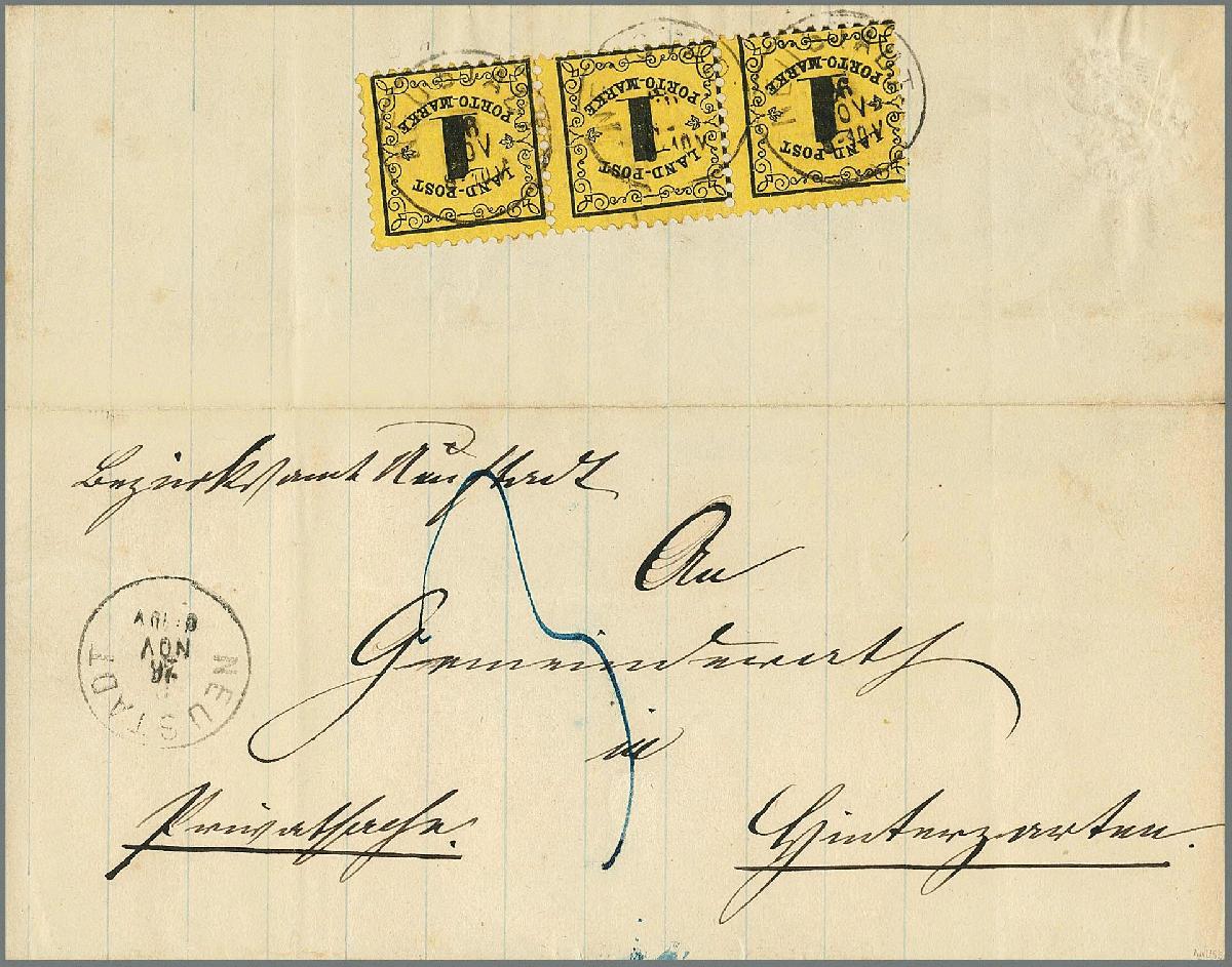 | Zusatzinformationen und Suchstichworte: | Rauhut & Kruschel - 228. Auktion 18. - 19. Oktober 2024 Los 108 Altdeutschland Baden Landpost 1 Kr. schwarz auf dunkelgelb, gutes dickeres Papier, im Dreierstreifen rs. (gut zeigbar) auf Brief (wie üblich ohne Seitenklappen links und rechts) mit K1 "Neustadt" nach Hinterzarten. Die rechte 1 Kr. ist einwandfrei, die beiden anderen mit kleinem Randriß bzw. einmal ein Fehlzahn, optisch gut. Seltene Einheit dieser guten Marke auf Ganzstück Ausruf 750,00 EUR |