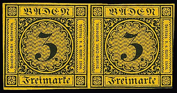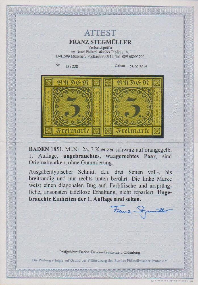 | Zusatzinformationen und Suchstichworte: | Rauhut & Kruschel - 228. Auktion 18. - 19. Oktober 2024 Los 1005 Altdeutschland Baden 3 Kr. schw./orangegelb, farbfrisches ungebrauchtes waagerechtes Paar, nur rechts unten kurz berührt, linke Marke unauffällige schräge Bugspur, sonst gut. Ungebrauchte Einheiten der ersten Auflage sind ausserordentlich selten, es dürften nur noch ein oder zwei weitere Paare existieren, Ausruf 1.000,00 EUR |