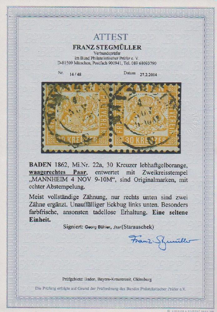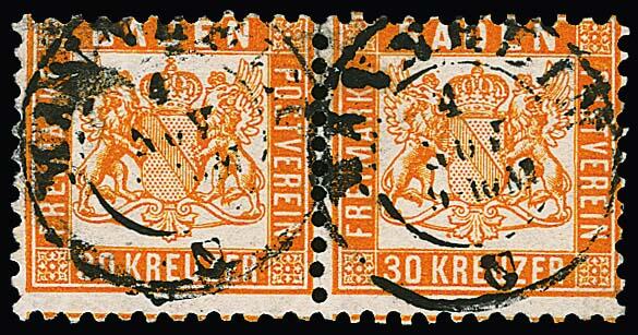 | Zusatzinformationen und Suchstichworte: | Rauhut & Kruschel - 228. Auktion 18. - 19. Oktober 2024 Los 1014 Altdeutschland Baden 30 Kr. gelborange, seltenes gestempeltes Paar mit K2 "Mannheim", rechts unten zwei verlängerte Zähne und links unten unauffälliger Eckbug, sonst farbfrisch und gut, gestempelte Paare sind selten Ausruf 1.500,00 EUR |