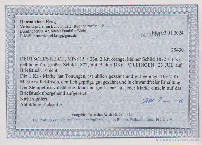 | Prüfer: | Krug, Hansmichael (BPP (Bund Philatelistischer Prüfer)) |