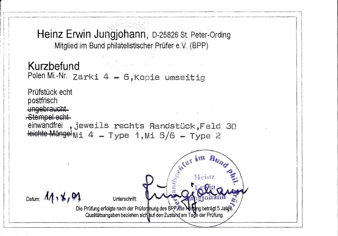 | Zusatzinformationen und Suchstichworte: | ebay.de ZARKI seltene Lokalausgabe Polen MiNr. 4-6 gest. Fotoattest Jungjohann BPP Ausruf 17,50 EUR |
