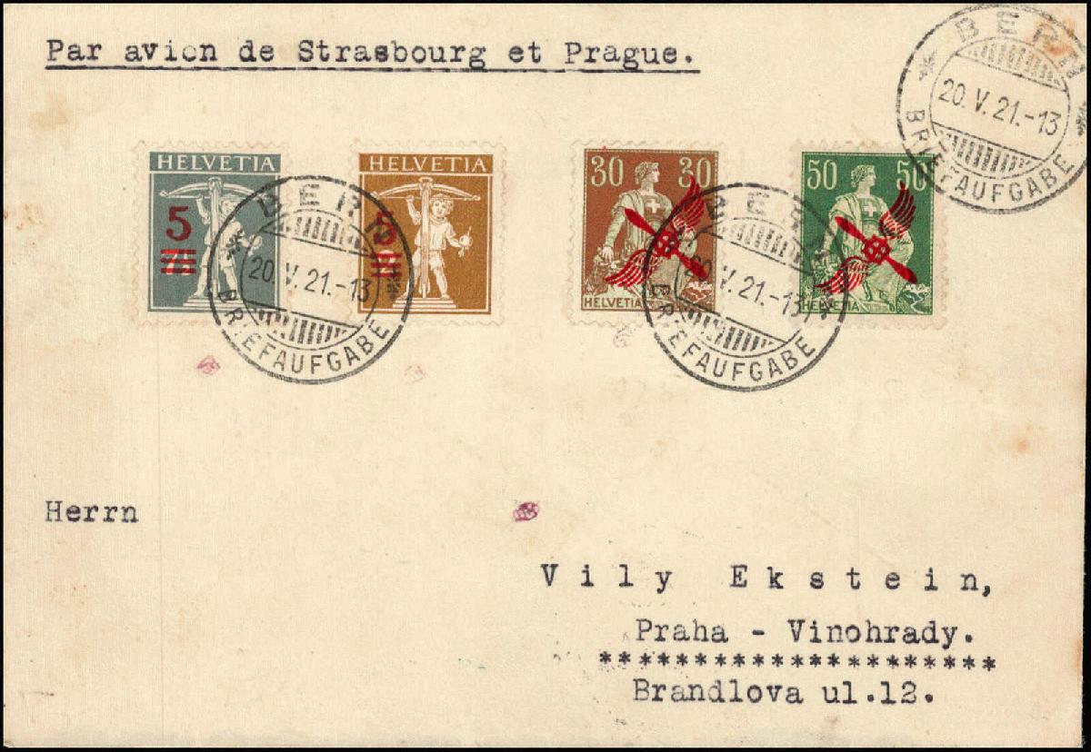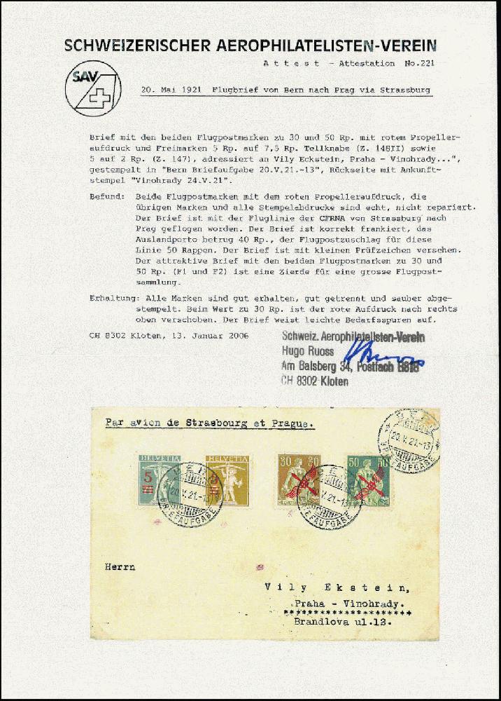 | Zusatzinformationen und Suchstichworte: | 56. Jean-Paul Bach Auktion 31. August 2024 Los 623 Schweiz - Fremde Flüge (FF) 1921, 21.V., mit der Fluglinie der CFRNA von Strasburg nach Prag geflogen worden. Der Brief ist korrekt frankiert, das Auslandporto betrug 40 Rp., Flugpostzuschlag für diese Linie 50 Rp. Der Brief ist mit kleinen Prüfzeichen versehen. Saubere Aufgabestempel BERN 20.V.21 und auf der Rückseite die Ankunftsstempel Prag-Vinohrady. Die attraktive Frankatur mit den beiden Flugpostmarken zu 30 und 50 Rp. ist eine Zierde für eine grosse Flugpostsammlung Ausruf 1.000,00 CHF |