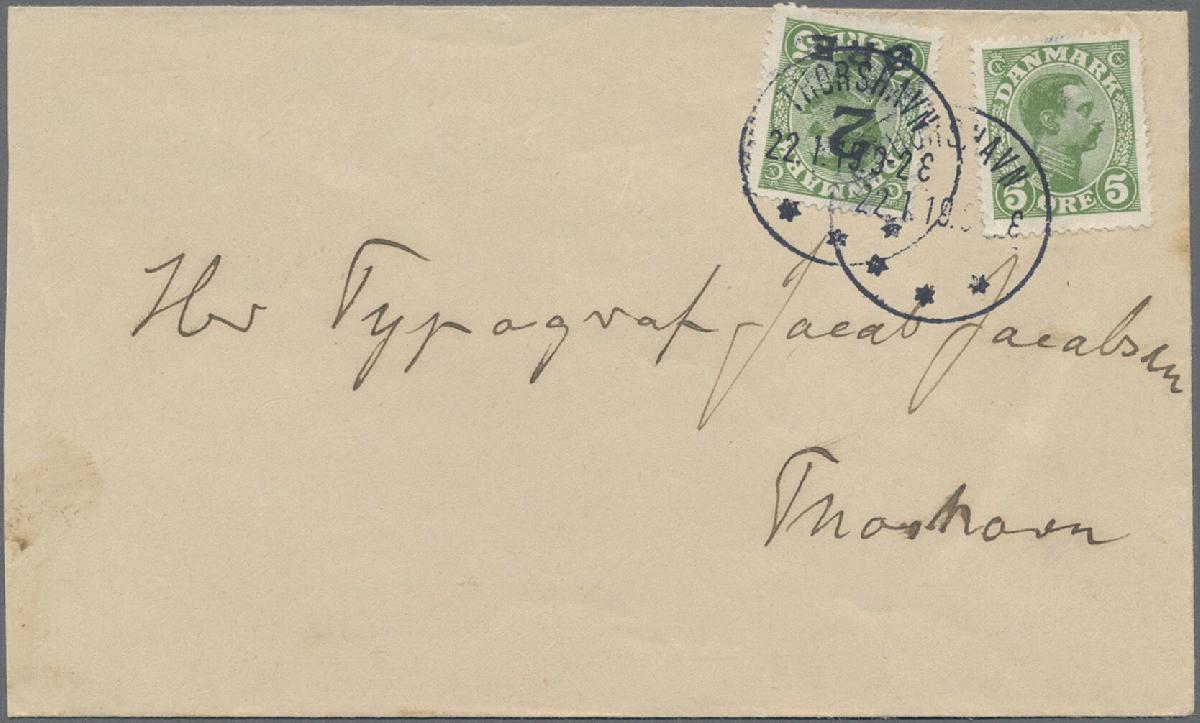 | Zusatzinformationen und Suchstichworte: | Christoph Gärtner 60. Auktion 16. Oktober 2024 Los 4781 Färoer 1919, 2 Ö. auf 5 Ö. hellgrün zusammen mit Dänemark Nr. 67 auf Briefumschlag (links etwas verkürzt), Stempel THORSHAVN 22.1.19, tadellose Erhaltung Ausruf 150,00 EUR |