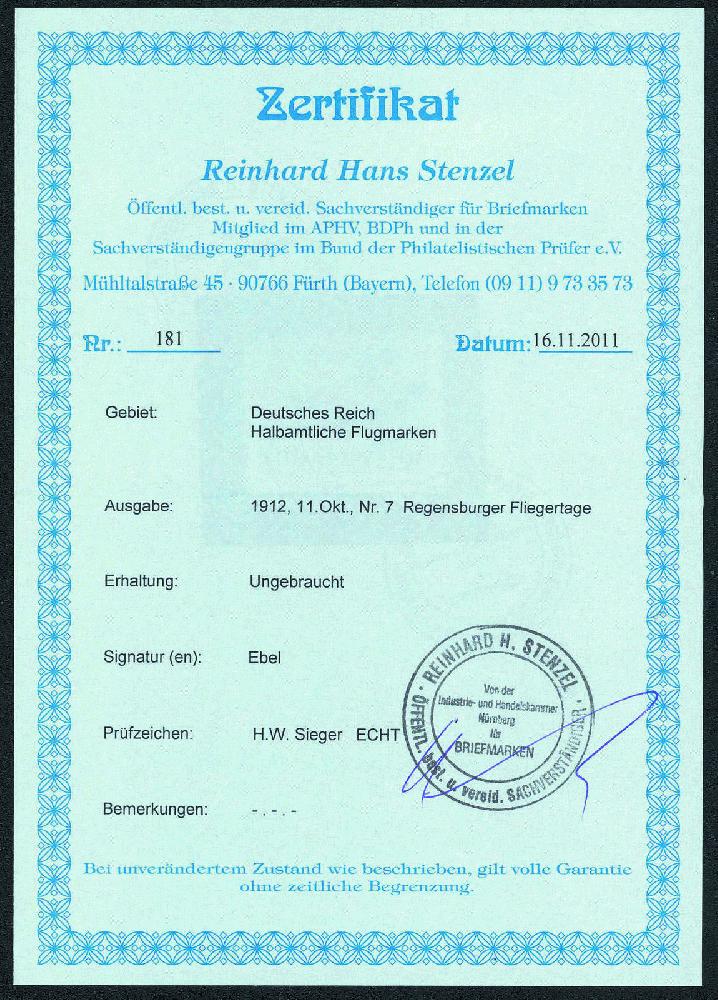 | Prüfgebiet: | Deutsches Reich halbamtliche Flugpostausgaben |