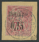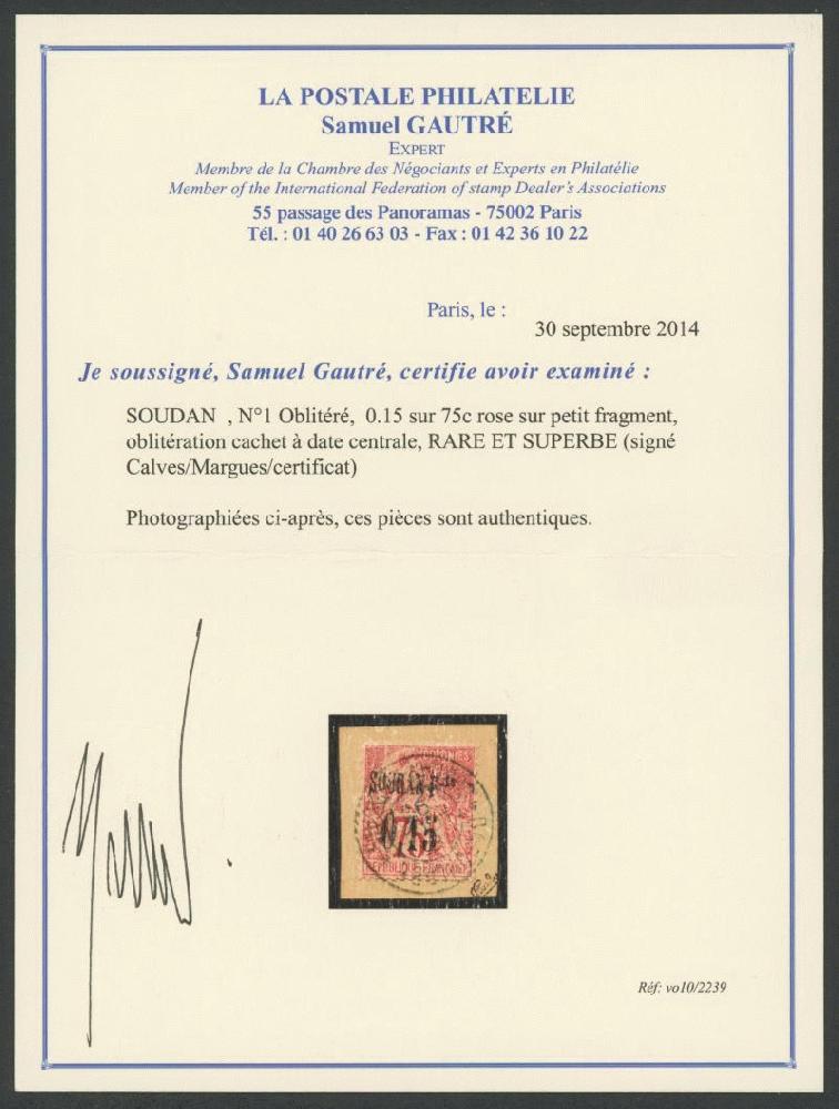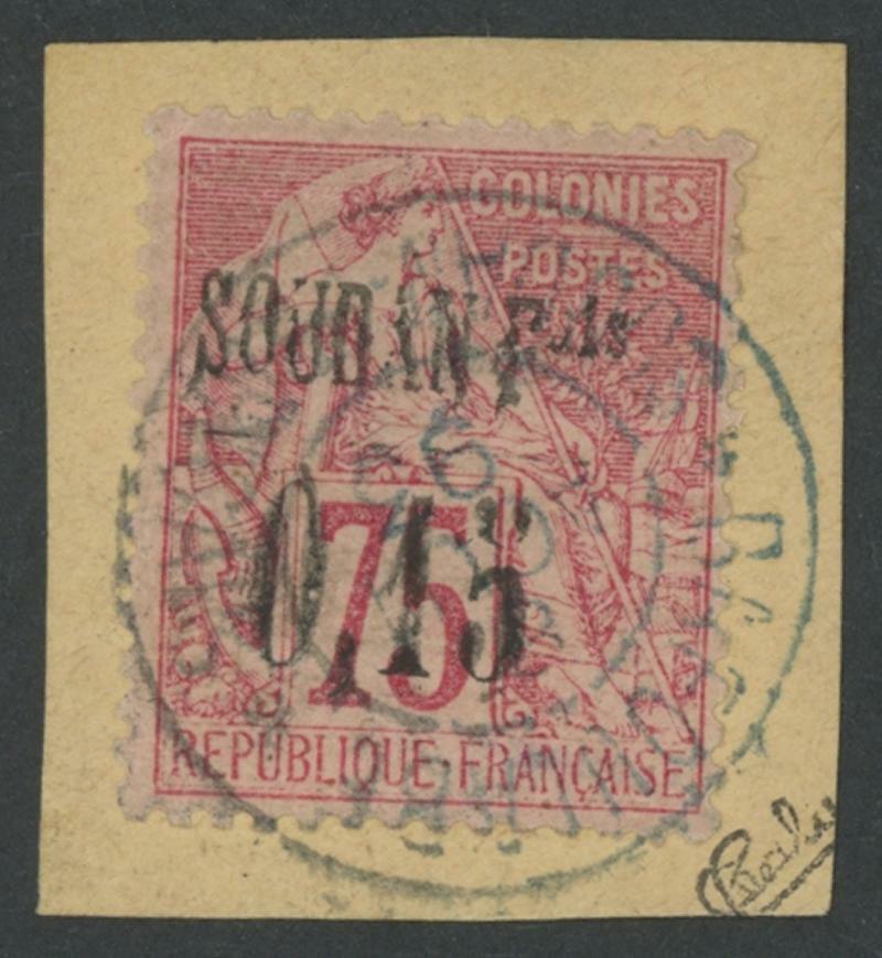 | Zusatzinformationen und Suchstichworte: | 257. Abacus Auktion 27. - 30. August 2024 Los 1875 Französisch Sudan Französischer SUDAN: 1894 Aufdrucke auf Kolonien, allgemeine Ausgaben SOUDAN Fais/0, 15 auf 75c karmin SG 1 (Dallay 1), gut zentriert, entwertet auf kleinem Briefstück bei fein komplett BAFOULABE/SOUDAN- FRANCIASE Kreisdatumsstempel in blau, Katalogwert £3000 Ausruf 1.150,00 AUD |