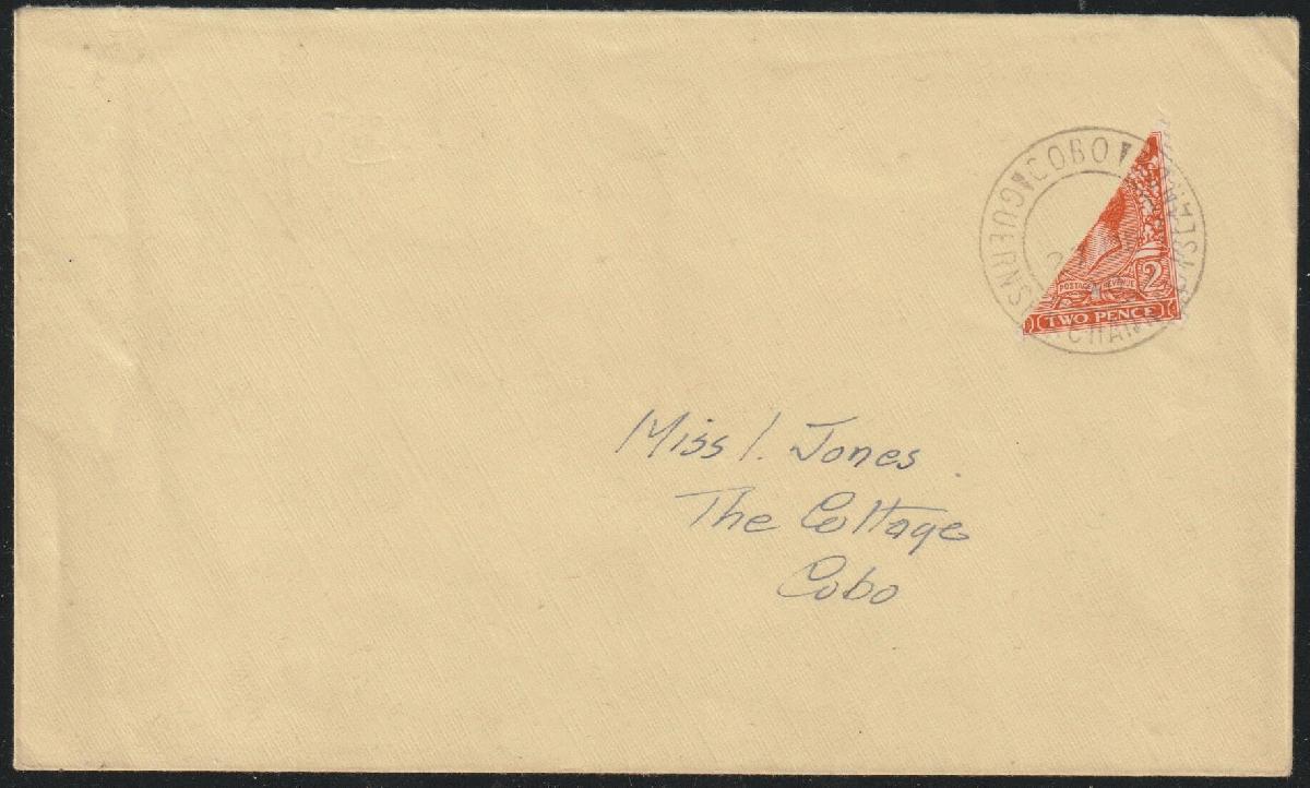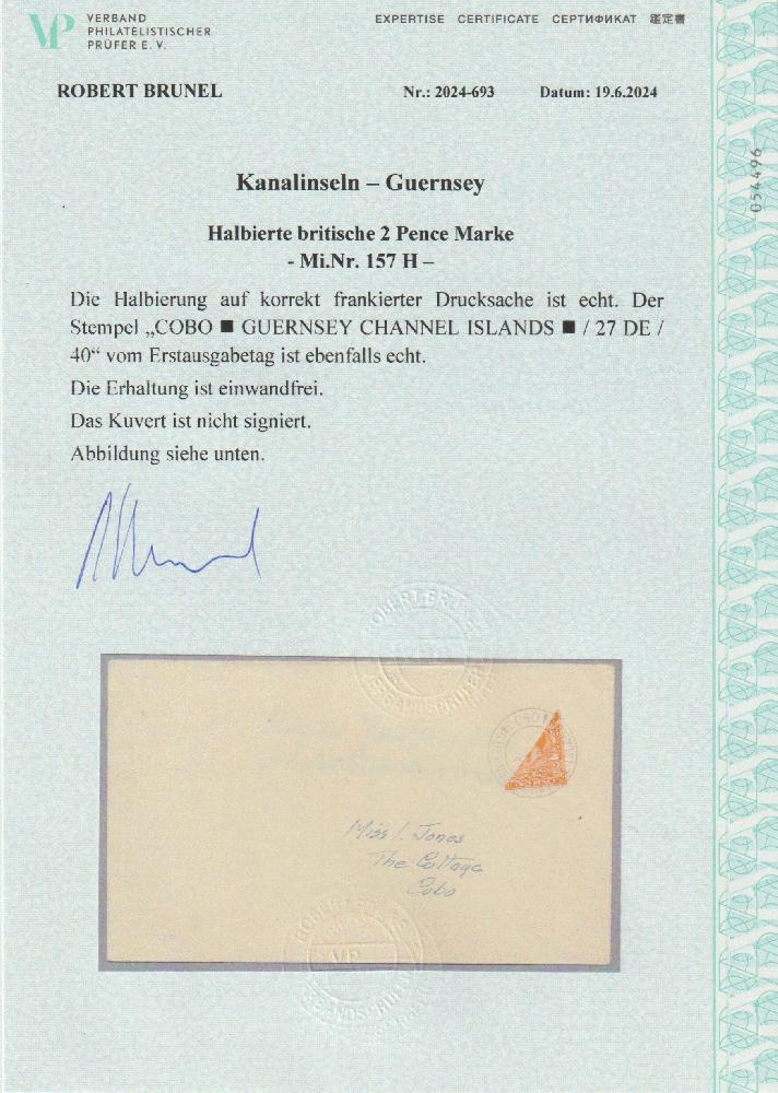 | Zusatzinformationen und Suchstichworte: | Philadria 32. Auktion 12. Oktober 2024 Los 433 Deutsche Besetzung II. WK Guernsey 1940 Channel Islands, German Occupatio. Guernsey. Philatelically inspired cover with diagonally bisected GB 2 pence stamp, cancelled on the First Day of Issue. Cobo, Guernsey (27 DE /40). Ausruf 50,00 EUR |