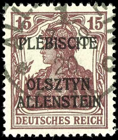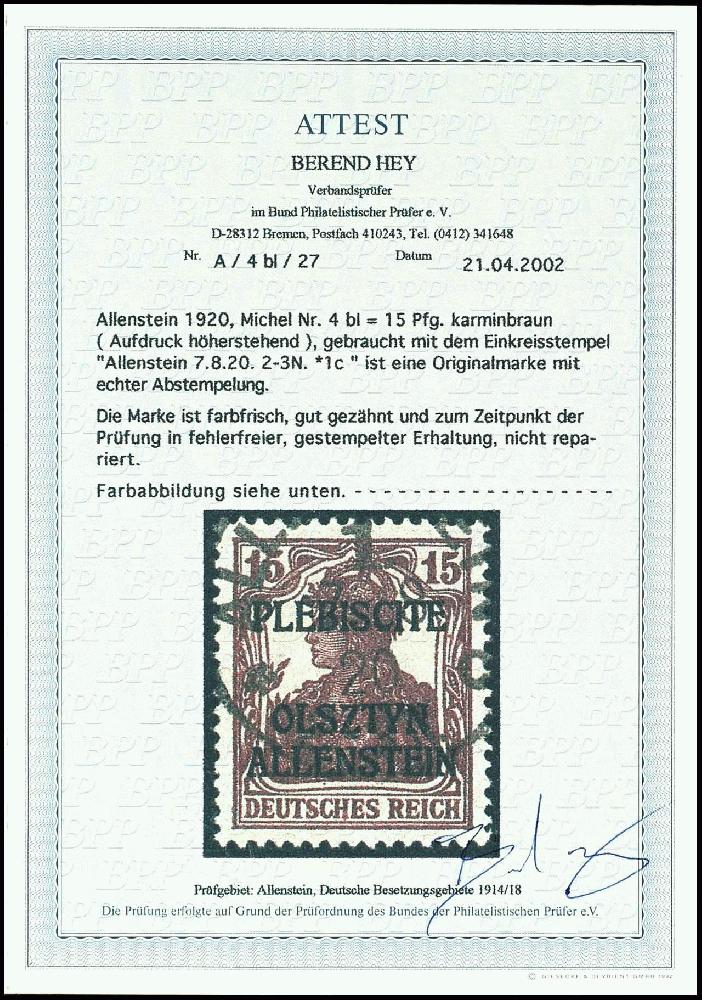 | Zusatzinformationen und Suchstichworte: | Dr. Reinhard Fischer 186. Auktion Auktionstermin: 18. - 21. Mai 2022 Los 2807 Allenstein 15 Pfg Germania karminbraun mit höher stehendem Aufdruck, sog. "Siegesmarke", zentrisch gestempelt K1 "ALLEINSTEIN 1 c 7.8.20", äußerst attraktives Stück der sehr seltenen Marke, Fotoattest Hey BPP: "Die Marke ist farbfrisch, gut gezähnt und [...] in fehlerfreier, gestempelter Erhaltung, nicht repariert.", im Mi. unbekannt! Ausruf 300,00 EUR |