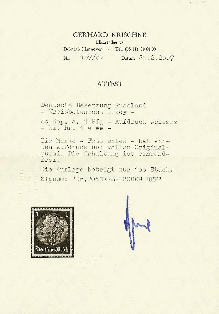 | Zusatzinformationen und Suchstichworte: | Dr. Derichs 178. Auktion 14. September 2024 Los 2443 Deutsche Besetzung II. WK Russland Ljady 60 K. auf 1 Pfg. schwarz, Aufdruck schwarz, postfrisches Luxusstück. Fotoattest Krischke: "Die Erhaltung ist einwandfrei.". (Michel 7.000.-). Anmerkung: Die Auflage dieser Marke beträgt nur 100 Stück. Zuschlag 3.400,00 EUR |