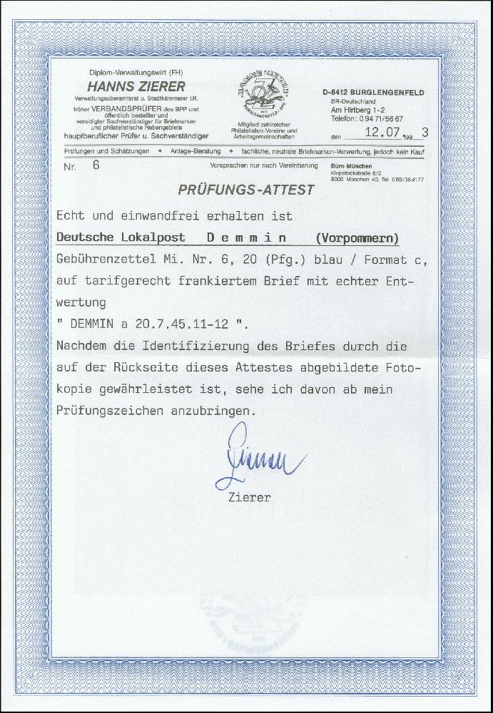 | Prüfgebiet: | Deutsche Lokalausgaben 1945 Demmin |