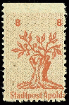 | Zusatzinformationen und Suchstichworte: | Dr. Reinhard Fischer 198. Auktion 21. August 2024 Los 3342 Deutsche Lokalausgabe Apolda 8 Pf. hellorange vom Oberrand, Type II, Besonderheit "Baumstumpf mit neun Zweigen" und zusätzlichen "Unterdruck rückseitig", tadellos postfrisch, Ausruf 90,00 EUR |