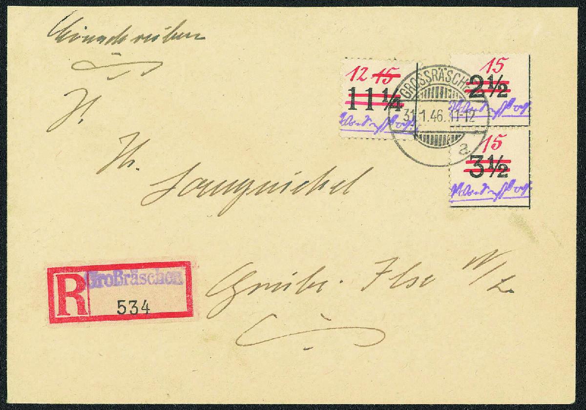 | Zusatzinformationen und Suchstichworte: | Gert Müller 123. Auktion 22. August 2024 Los 4608 Deutsche Lokalausgabe Grossräschen Vorläufer Vorläufer, Uhrzeitklebezettel 15 Pfg. rot im senkrechten Paar, sowie 12 auf 15 Pfg. auf sehr schönem philatelistischem Einschreibebrief, wahrscheinlich nicht befördert, mit klarem Stegstempel "GROSSRÄSCHEN 31.1.46". Eine Rarität dieses Gebietes, die 15 Pfg. ist im Michel-Katalog lediglich ohne Preis notiert Zuschlag 810,00 EUR |