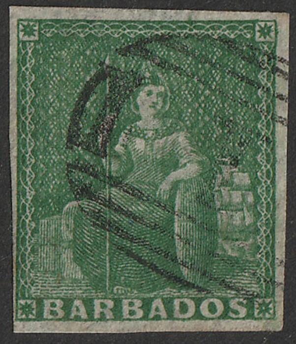 | Zusatzinformationen und Suchstichworte: | Status International Auktion 391 5. September 2024 Los 1857 Barbados 1855-58 Britannia (½d) grün, ungezähnt auf weißem Papier. Gestempelt, Pracht, 4 gerandet, Balken Ovalstempel SG 8 Katalogwert £150. 2002 RPSL Fotoattesten (P) (Schätzpreis 150 A$) Ausruf 110,00 AUD |