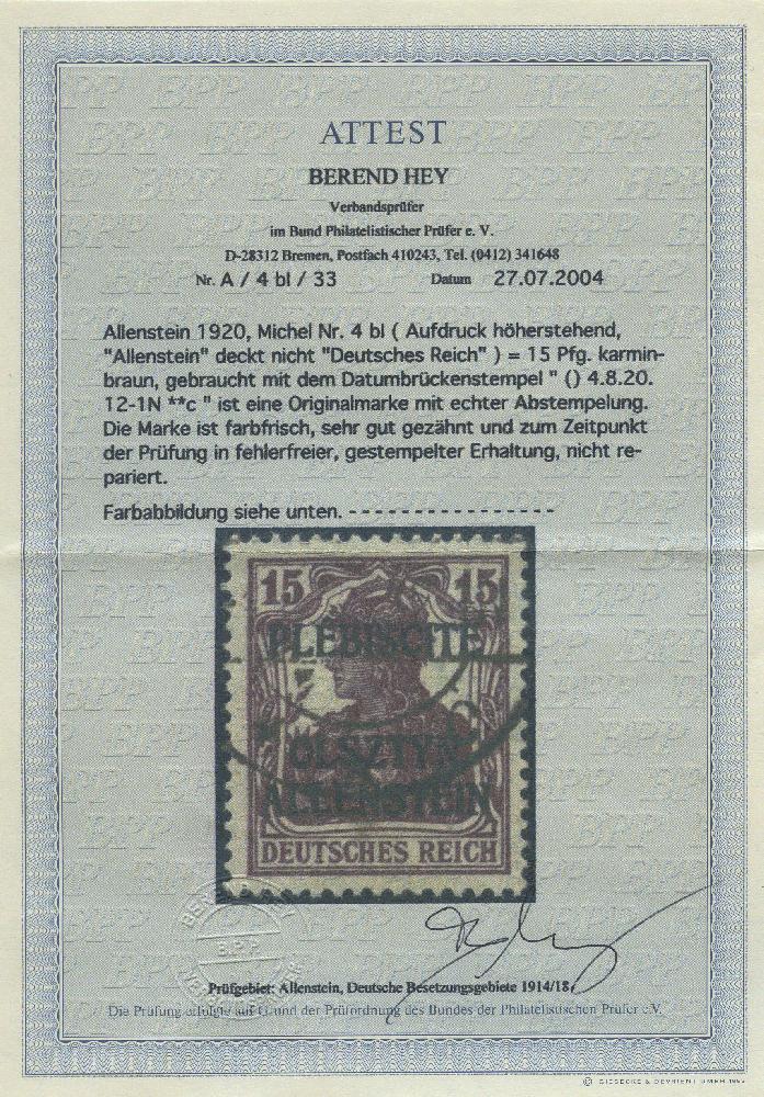| Prüfer: | Hey, Berend (BPP (Bund Philatelistischer Prüfer)) |