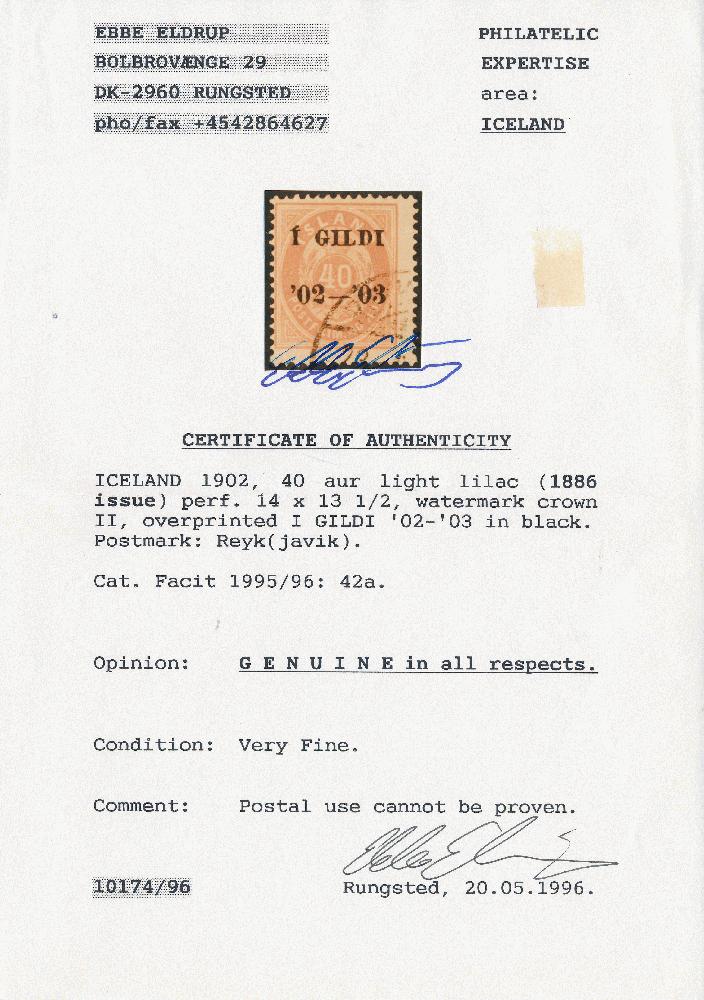 | Zusatzinformationen und Suchstichworte: | Postiljonen 242. & 243. Int. Briefmarken Auktion 24. - 27. September 2024 Los 1134 Island I Gildi Ausgabe Rare 40 aur light lilac with a small part of "REYKJAVIK" canc. Not priced in Facit. Cert. Ebbe Eldrup. VERY FINE. Ausruf 500,00 EUR 19.09.2024: Los zurückgezogen! |